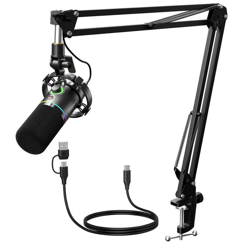 The podcast microphone has a 2-in-1 smart knob to adjust mic gain, and headphone volume, a one-click mute key with an LED indicator to help you instantly mute the mic, and real-time monitoring of 3.5 mm headphone jack monitor output voice as desired by recording professionals.