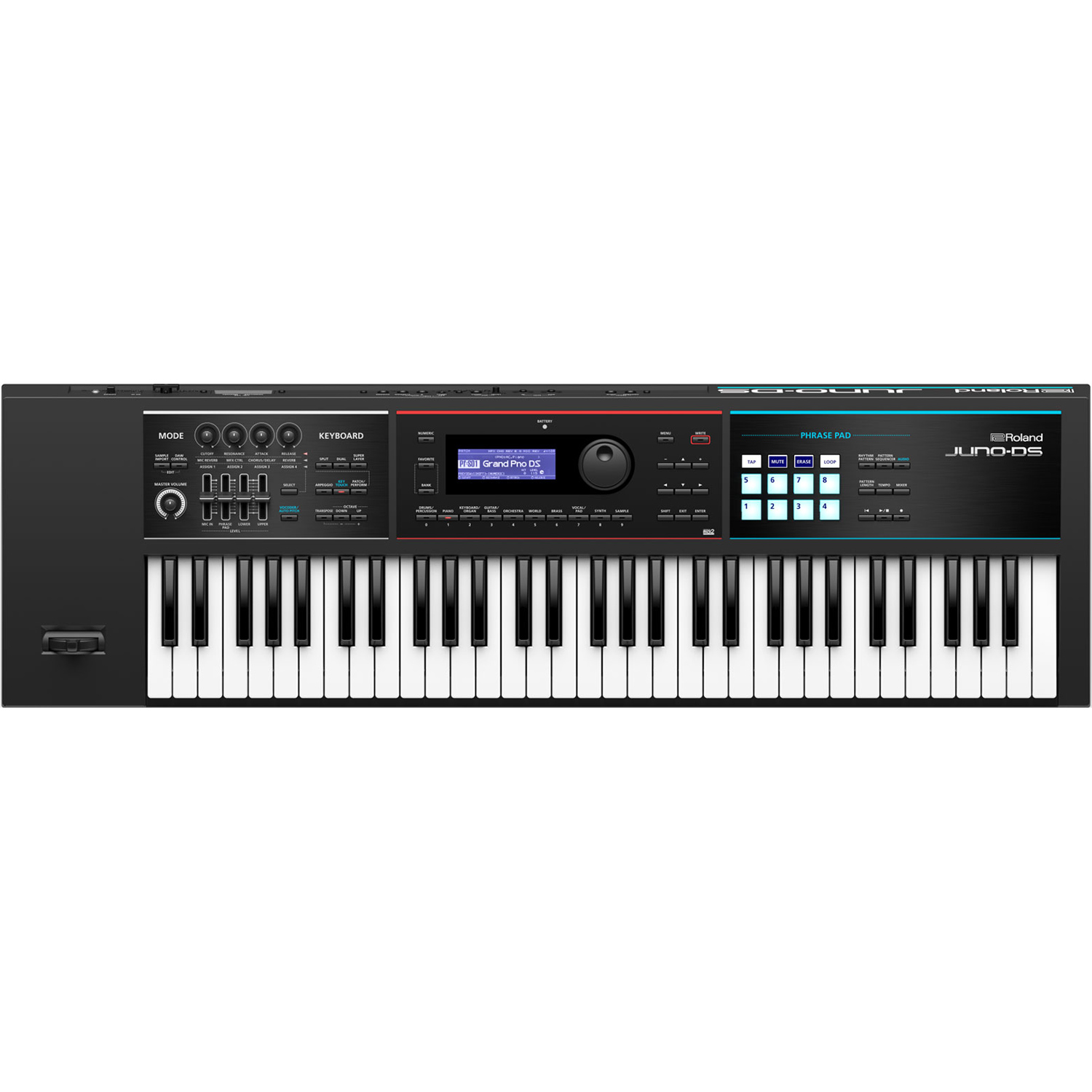 Performing keyboardists will find plenty to be happy about with the Roland JUNO-DS61. Its eight Phrase Pads allow you to supplement your performances with samples and music files that are stored on a USB memory stick. You can load up just about anything, including one-shot samples, vocals, sound effects, loops, and complete music tracks and trigger them with a touch of your finger.